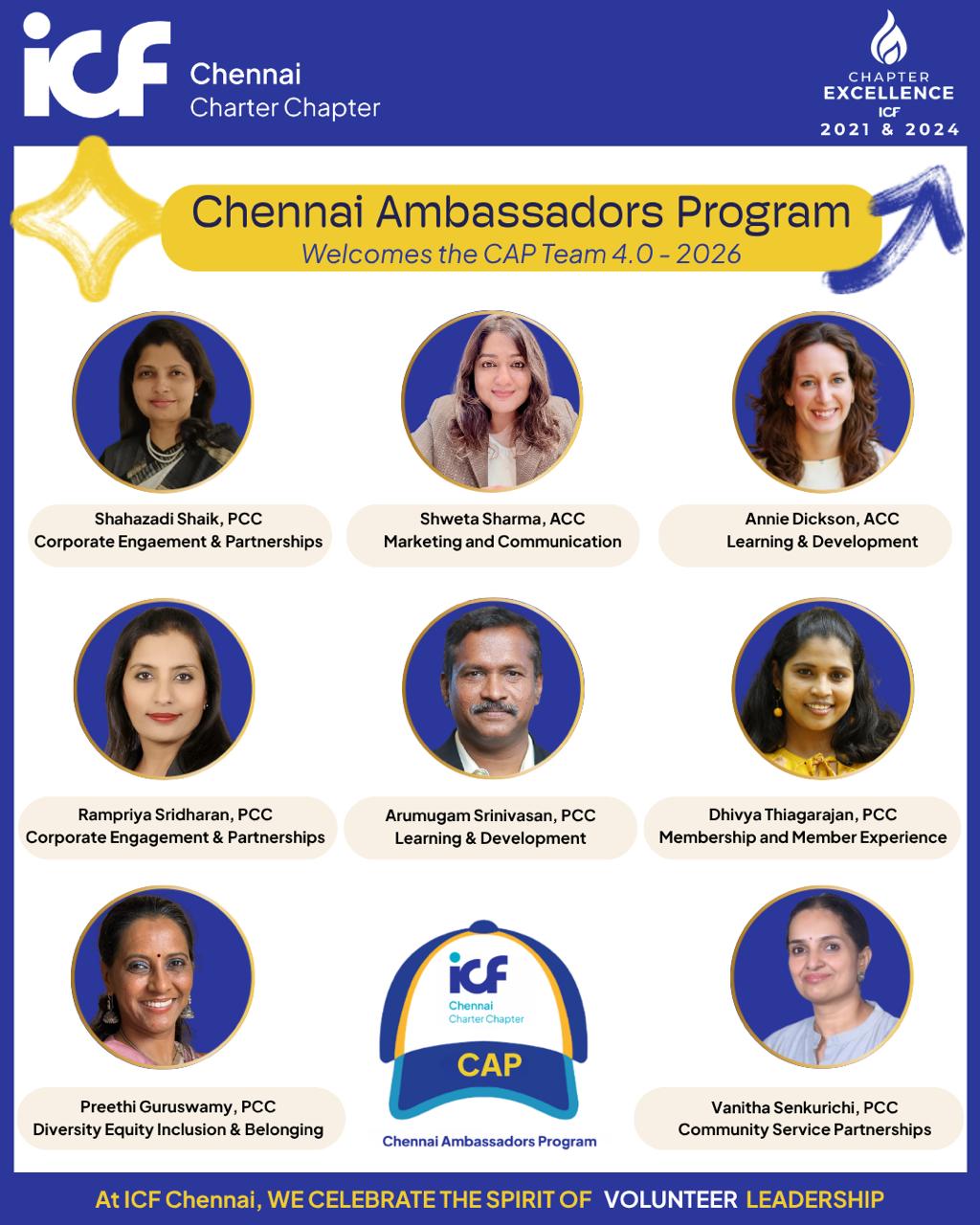 Hello and welcome to ICF Chennai Charter Chapter! It’s a privilege to share this message with you – ‘namma’ ICF Chennai Chapter as we fondly know it, is one of the most vibrant, welcoming and active and chapters in the ICF ecosystem. We’re proud to have been one of the 11 chapters worldwide chosen to receive the ICF Chapter Excellence Award in 2022 - believe this is a recognition of our growth, stability & good governance and builds on our attaining the status of a Charter Chapter in 2021. Above all else, it is a testimony to every coach, volunteer & leader in our Chapter, past & present whose efforts have made this such a wonderful journey..
