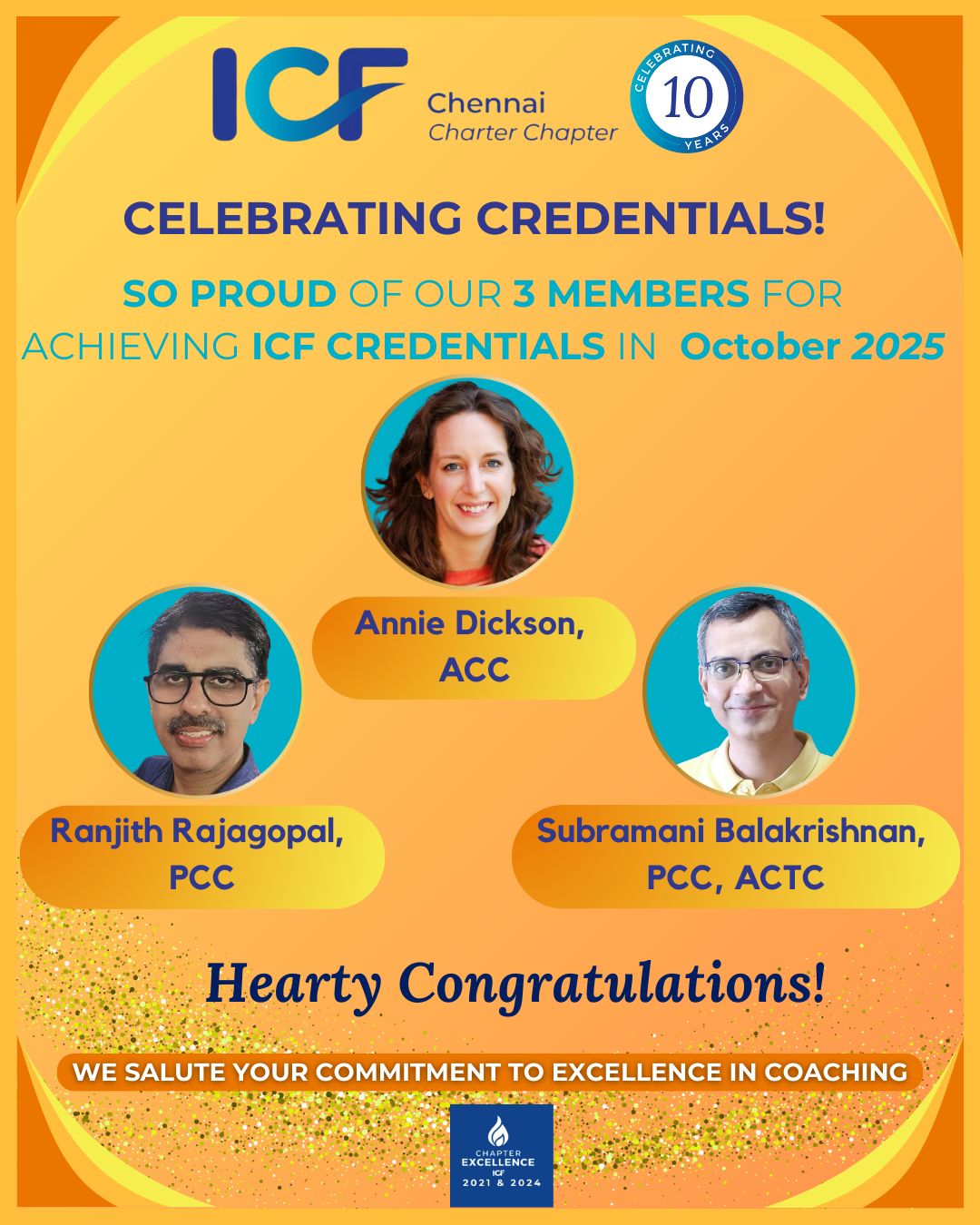 View MoreOn January 28, 2021 our Chapter reached a very special milestone. We were recognised as a Charter Chapter of ICF. Being a Charter Chapter is a recognition of our chapter’s growth, stability, good governance and compliance. It is an indicator of the successes ICF Chennai has achieved since its inception, just a few years ago! Above all else, it is a testimony to every coach, volunteer & leader in our Chapter, past & present who has worked hard to make this milestone possible. Each one deserves a salute! And to the wonderful spirit of community that is a trademark of ICF Chennai!